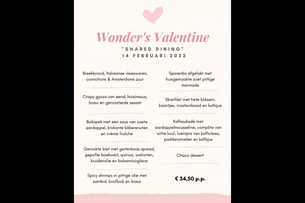 Vind je het leuk om romantisch samen te delen? Ga dan gezellig naar Wonders! Hier kun je samen genieten van een Shared Dining, allemaal kleine gerechtjes dus geen keuzestress! €34,50 p.p.