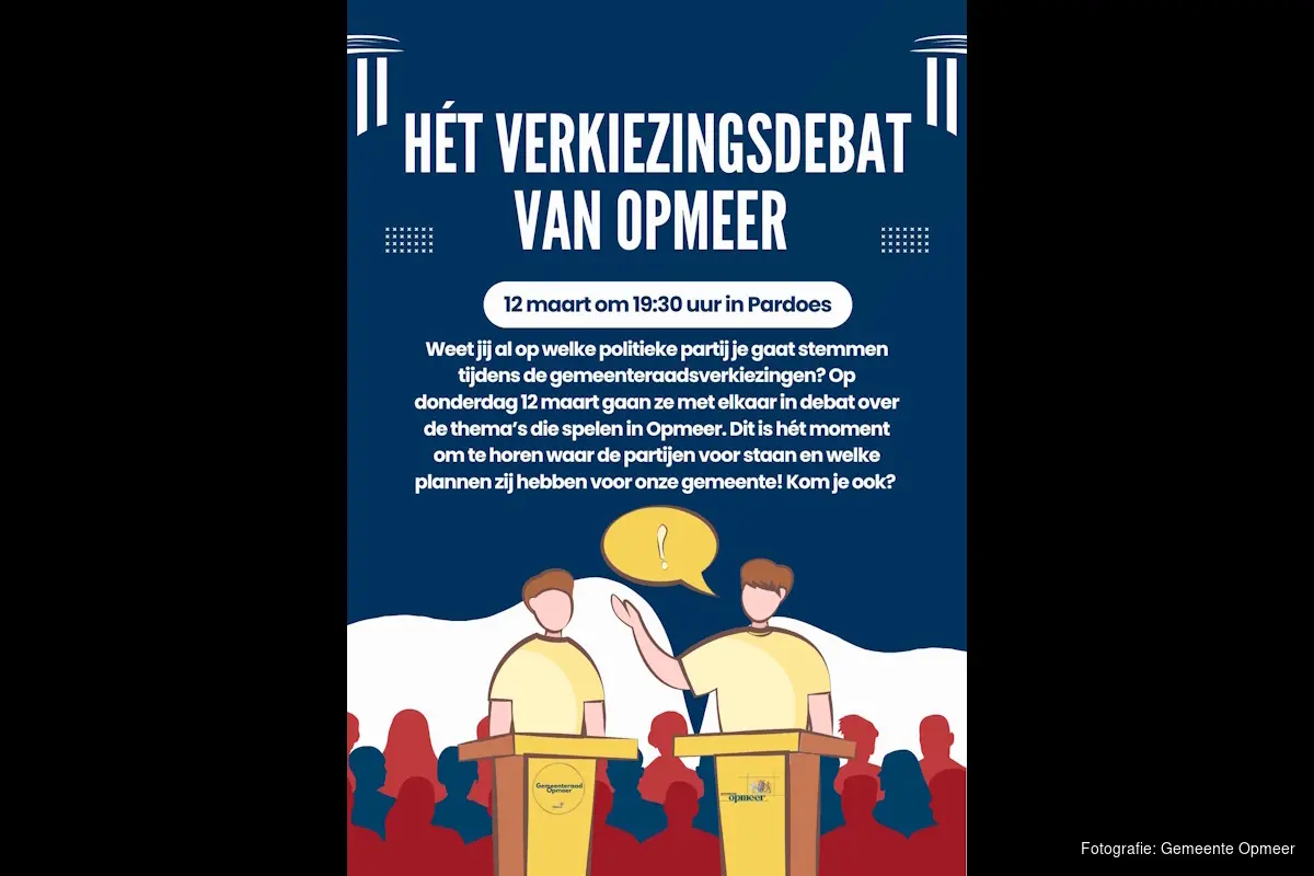 Op donderdagavond 12 maart gaan de lokale politieke partijen uit Opmeer met elkaar in debat over de thema’s die spelen in Opmeer. Dit is hét moment om te horen waar de partijen voor staan en welke plannen zij hebben voor onze gemeente! Het debat start om 20.00 uur en de inloop is vanaf 19.30 uur. Je hoeft je niet op te geven. Ben jij er ook bij?