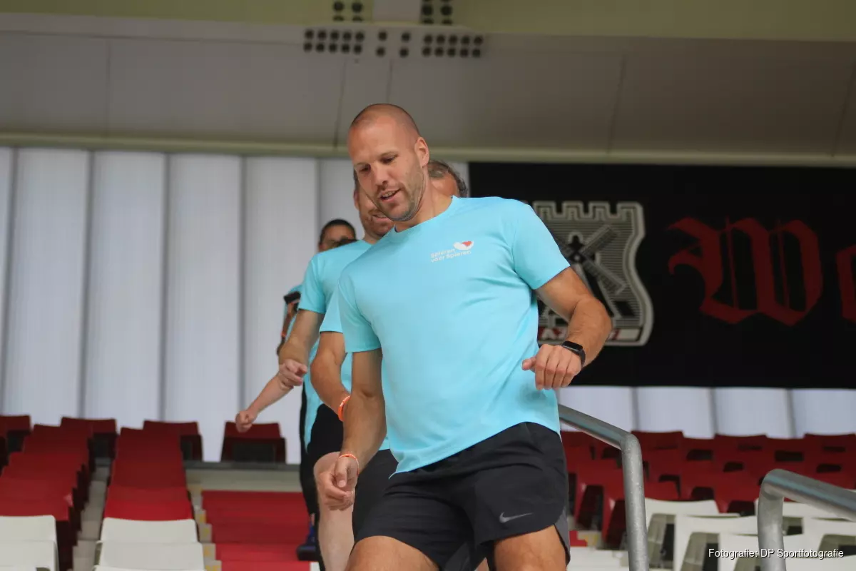 Ondertussen gaan de laatste groepen van start waaronder XYTO Media-redacteur Paul van der Molen. De 54-jarige Heerhugowaarder viel in de afgelopen negen maanden 35 kilo af en ziet de Trap voor Trap-challenge tevens als een uitdaging voor zichzelf, maar doet het bovenal voor het goede doel. “Ik ken Ron Vlaar al ruim twintig jaar uit de tijd dat ik zelf nog verslagen schreef voor de AZ Jeugdopleiding en heb groot respect voor zijn voetballoopbaan, maar ook wat hij daarbuiten doet voor Spieren voor Spieren. Daarnaast ben ik al meer dan 40 jaar AZ-supporter en wat is er mooier dan door je eigen stadion te lopen en daarmee een steentje bij te dragen aan deze geweldige actie.”